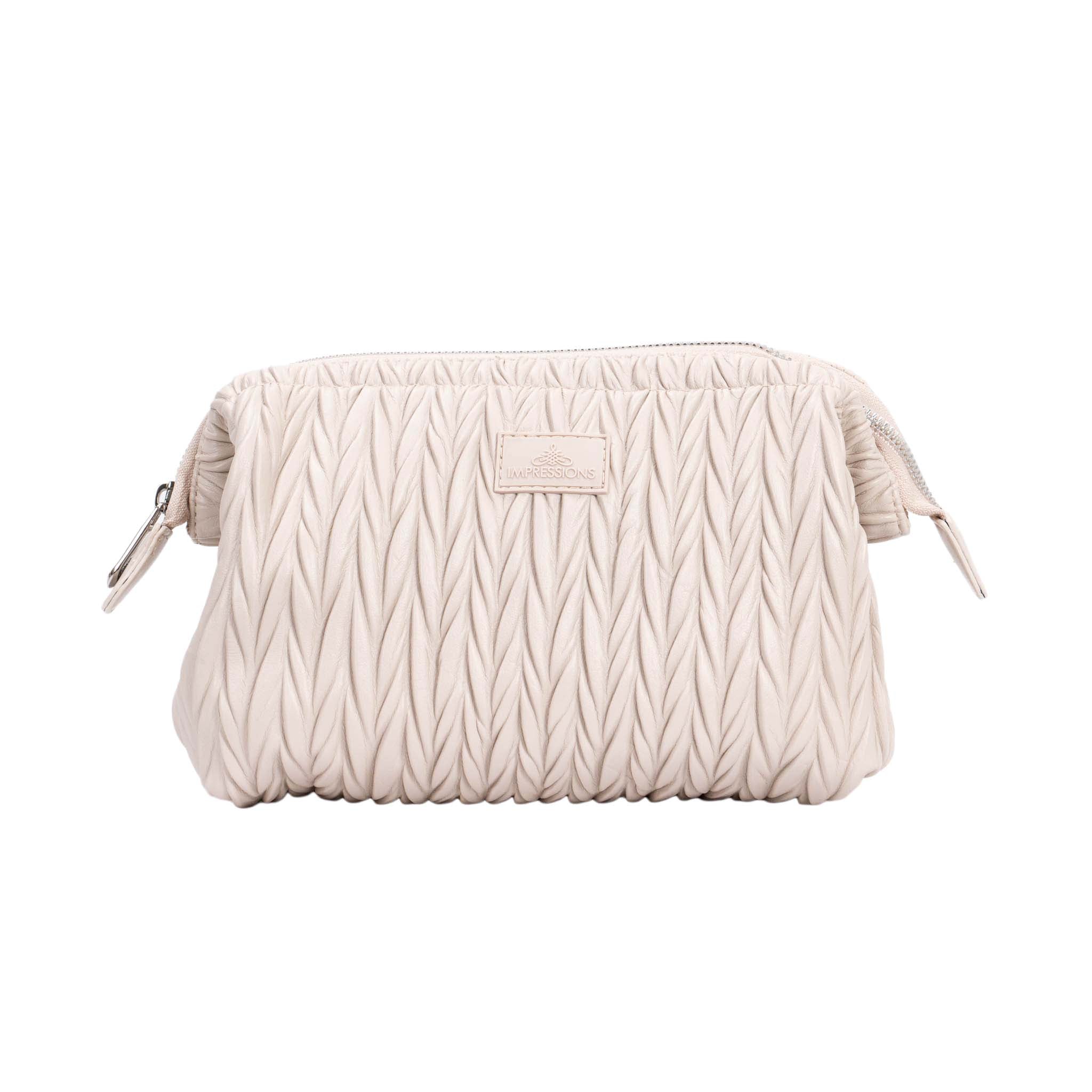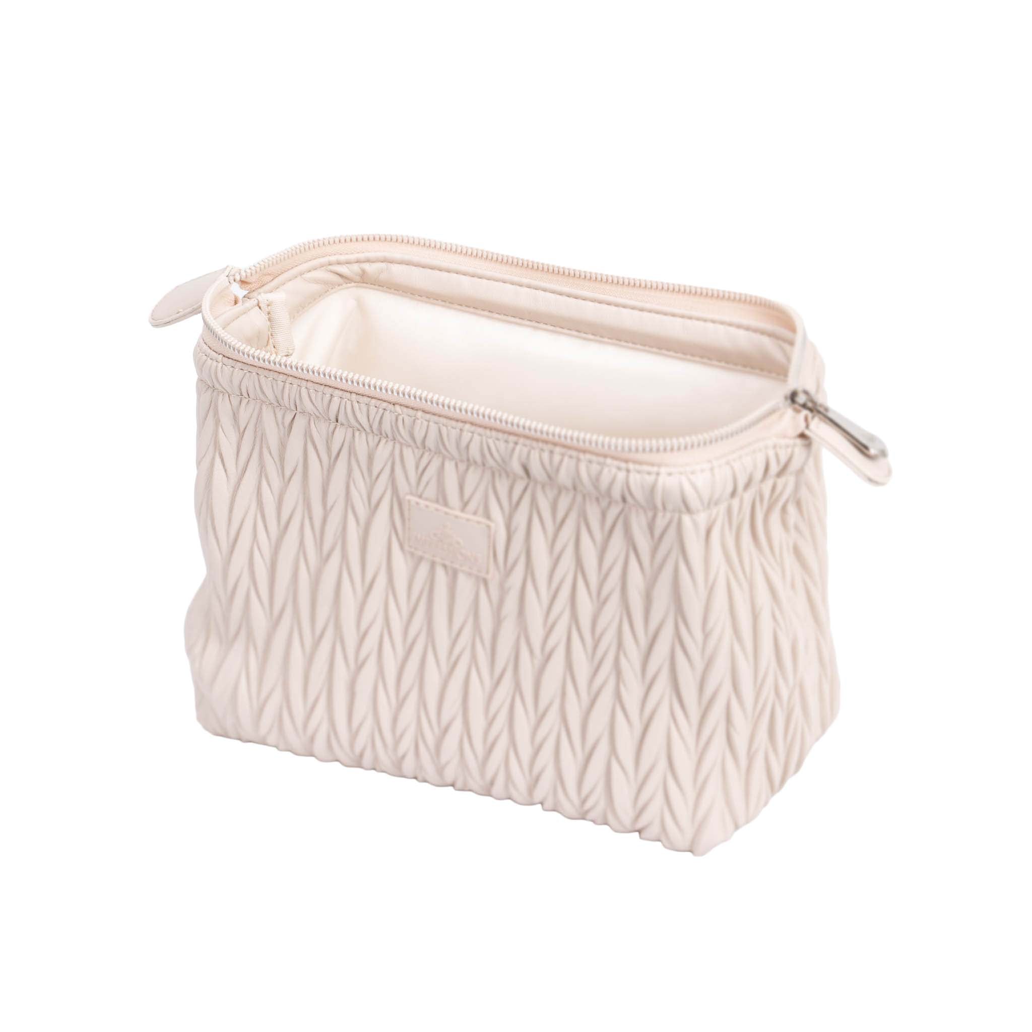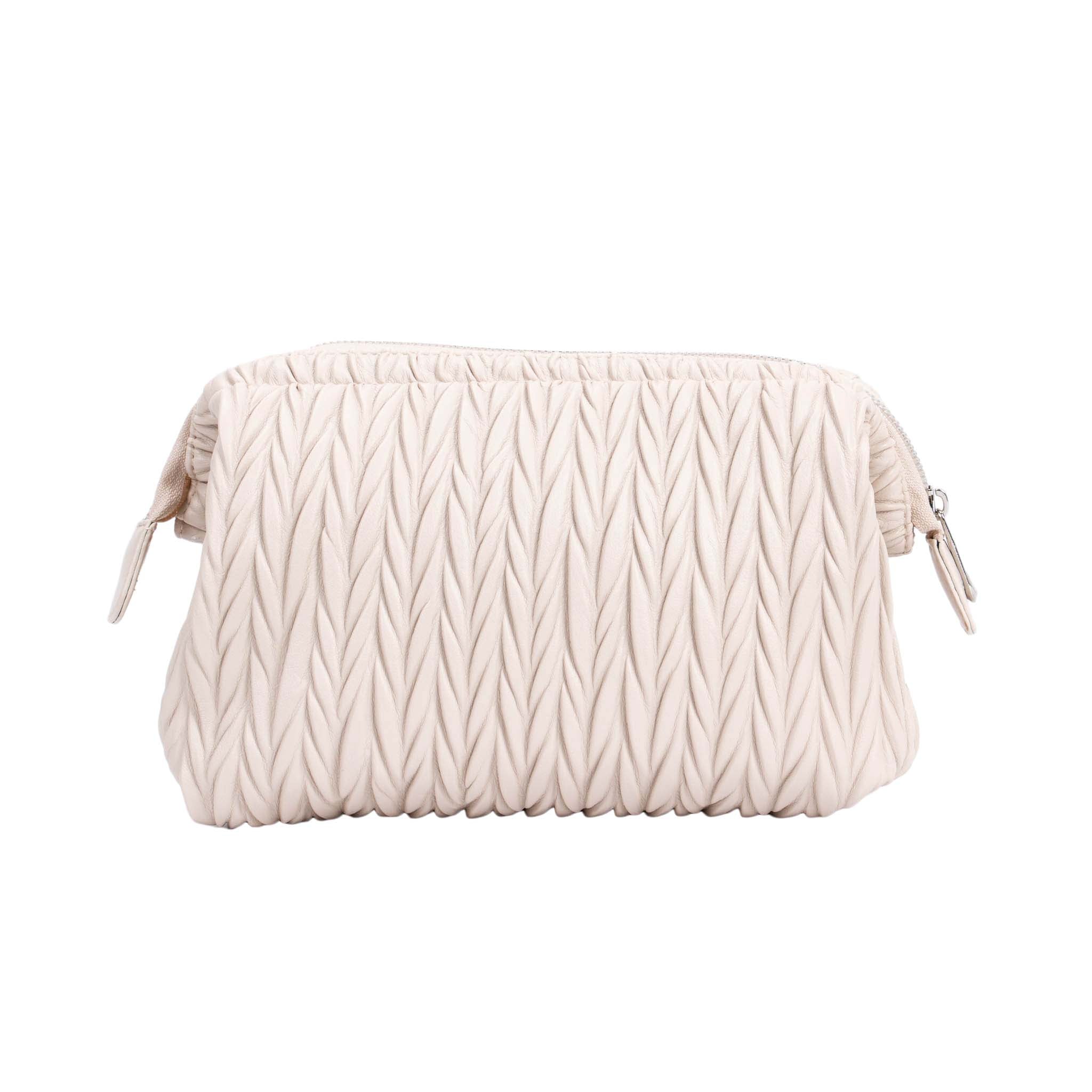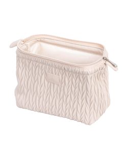 The Cannes cosmetic bag features a luxurious matelassé pattern that adds depth and elegance to its design, creating a three-dimensional effect. Crafted from smooth faux leather, this bag combines timeless style with practicality.