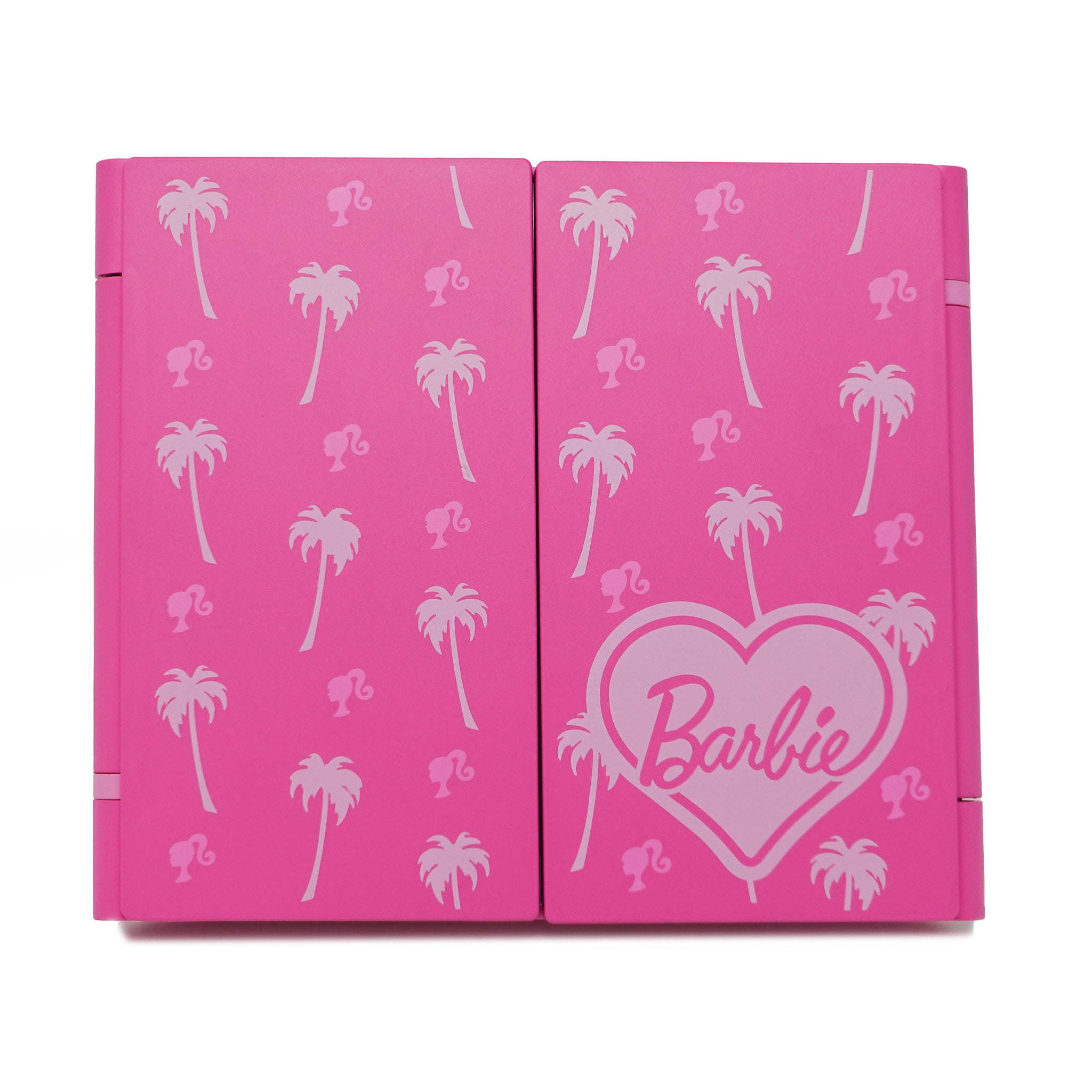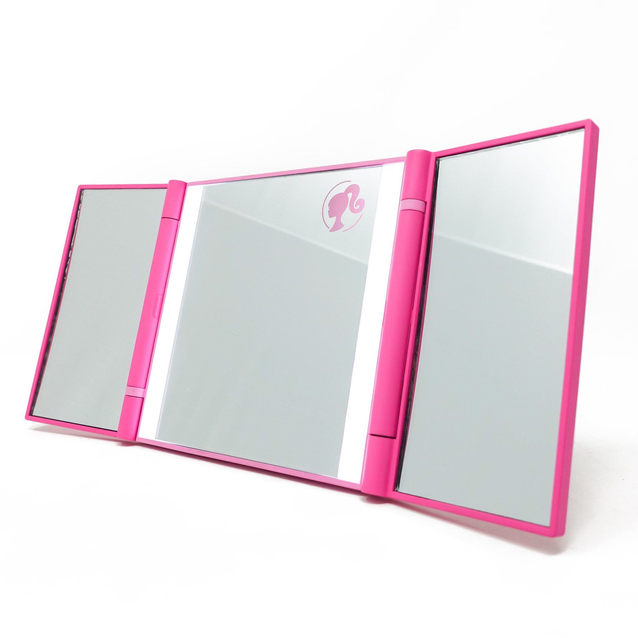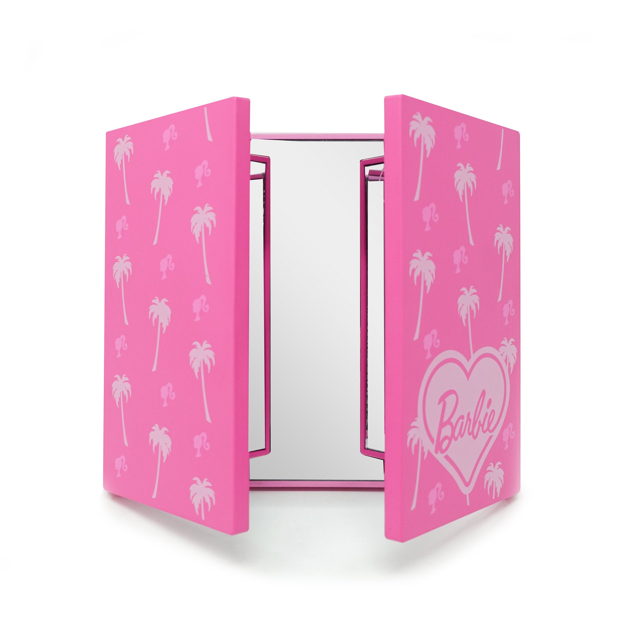 Touch up your makeup throughout the day with the Barbie™ Trifold Mini LED Makeup Mirror. This compact gem is your ideal companion for makeup application or quick touch-ups, no matter where you are.Adorned with the iconic Barbie™ silhouette and palm trees, it boasts a foldable stand on the back, allowing you to conveniently place it in your bathroom, vanity, or even hotel room. Plus, it’s compact enough to slip into your purse or gym bag, making it your trusted on-the-go beauty companion.The built-in LED light provides perfect visibility, ensuring you achieve flawless results in any environment. Charge it wirelessly with its QI compatibility or plug it in via USB.