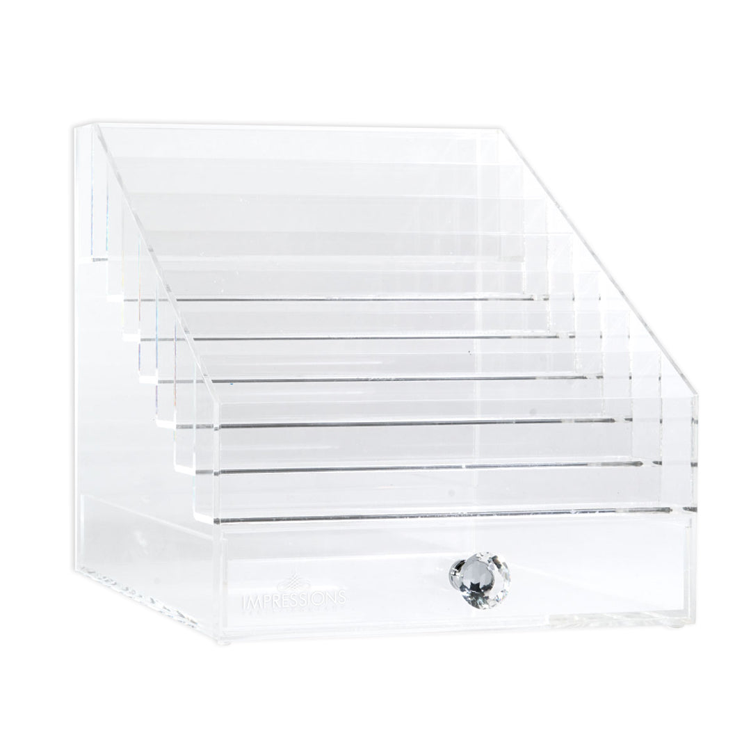 Organize and showcase your makeup with elegance with the Diamond Collection 8-Tier Acrylic Palette Holder. This organizer is ultra-versatile and will fit a variety of arrangements and combinations. Made with high-quality crystal-clear Lucite acrylic with luxurious diamond-style knobs, they are the perfect compliment to your Hollywood Vanity Mirrors!