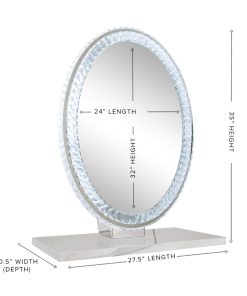 Designed in collaboration with Tamanna Roashan (@DressYourFace and @DressYourPlace), the Diamond Collection is the pinnacle of vanity luxury. The Oval Premium Mirror gleams from its crystal frame with its built-in energy-efficient LED strip lights. With the touch-sensitive power remote, you can transition from cool to warm lighting. Adjust the brightness to the level you want!Comes in two options for this mirror: a tabletop version and a wall-mountable version. 1. he tabletop option: includes 1 power outlet and 2. USB ports on the back of the mirror for your vanity accessories or device charging needs. Also includes a polished chrome base. 2. The wall-mount option: includes a wall mounting kit. *3 AAA batteries sold separatelyWe love seeing your photos! Tag us on Instagram to submit your photo for a chance feature on our pages! Patent Pending