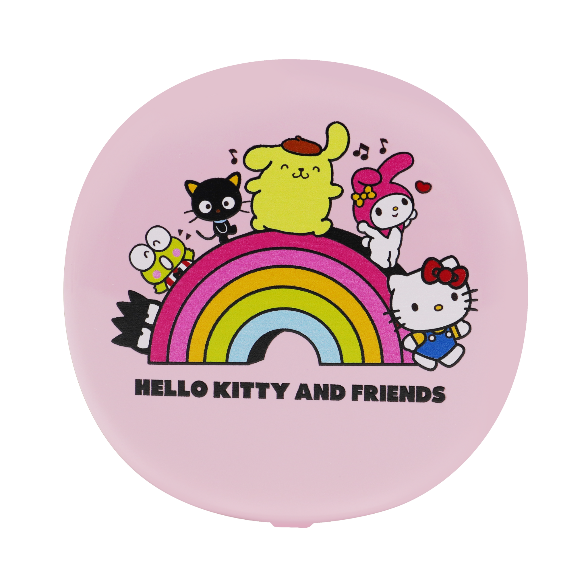 Embrace in friendship with this LED compact! Featuring Hello Kitty®, My Melody™, Pompompurin™, Chococat™, Keroppi™, and Badtz-maru™ posing on a rainbow.