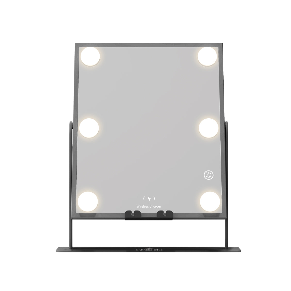 Our best-selling Hollywood Tri-Tone Makeup Mirror is back better than ever! Now featuring Bluetooth speakers and Wireless charging technology, you can fit this mirror anywhere and complete your vanity set! Equipped with built-in long-lasting LED Lights around the mirror for even lighting. Tap the power button to power it on/off and hold to adjust the brightness to your perfect level. Tap to switch between natural, warm, or cool lighting.