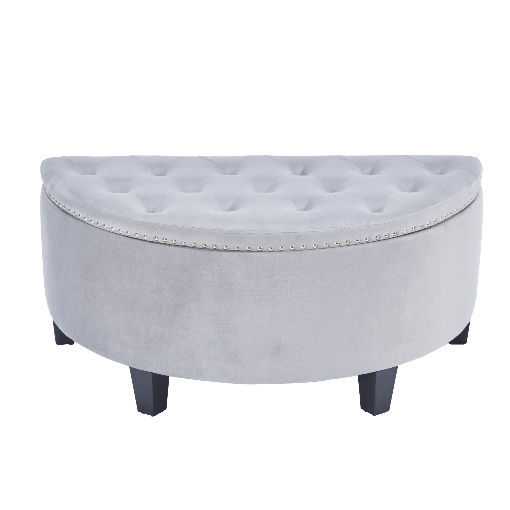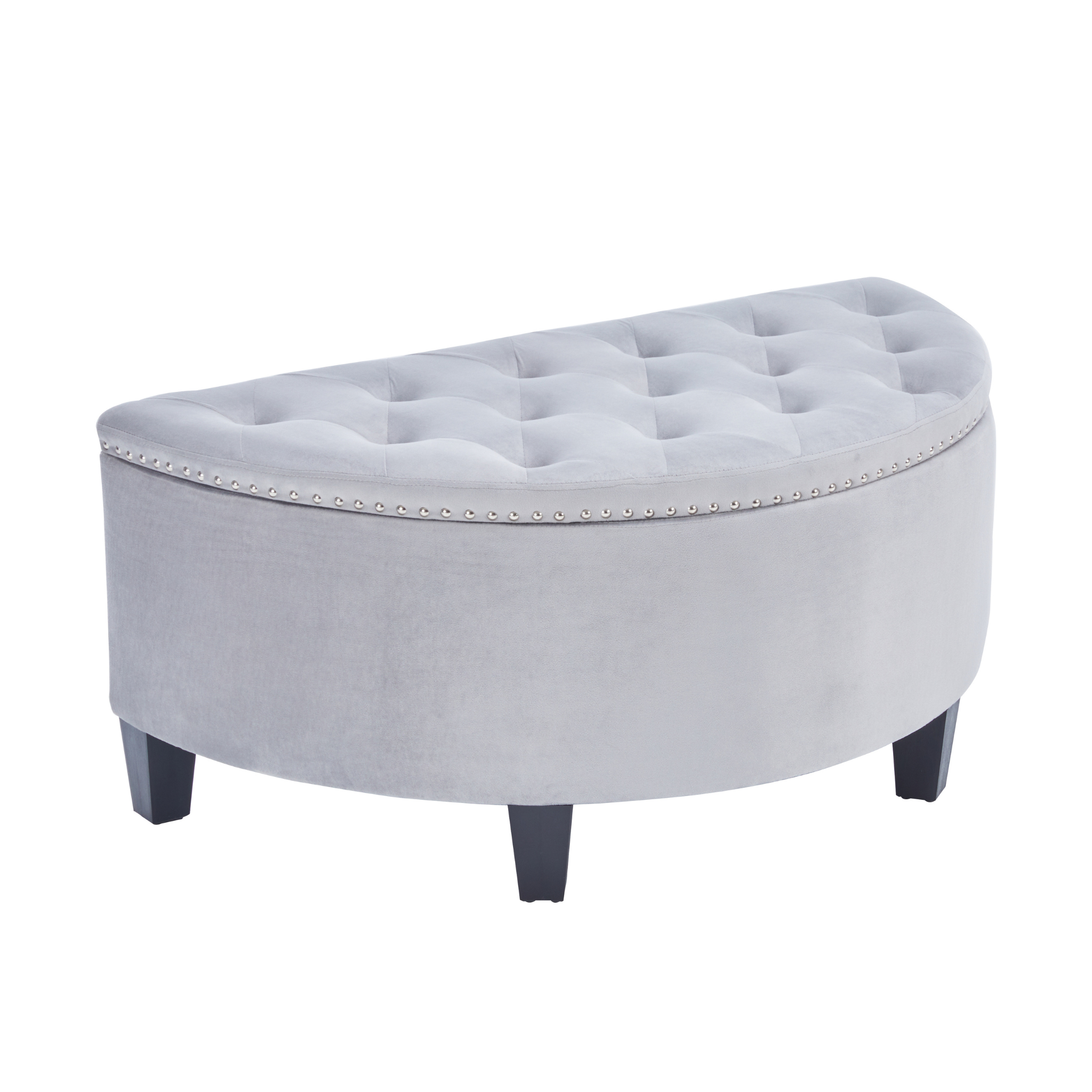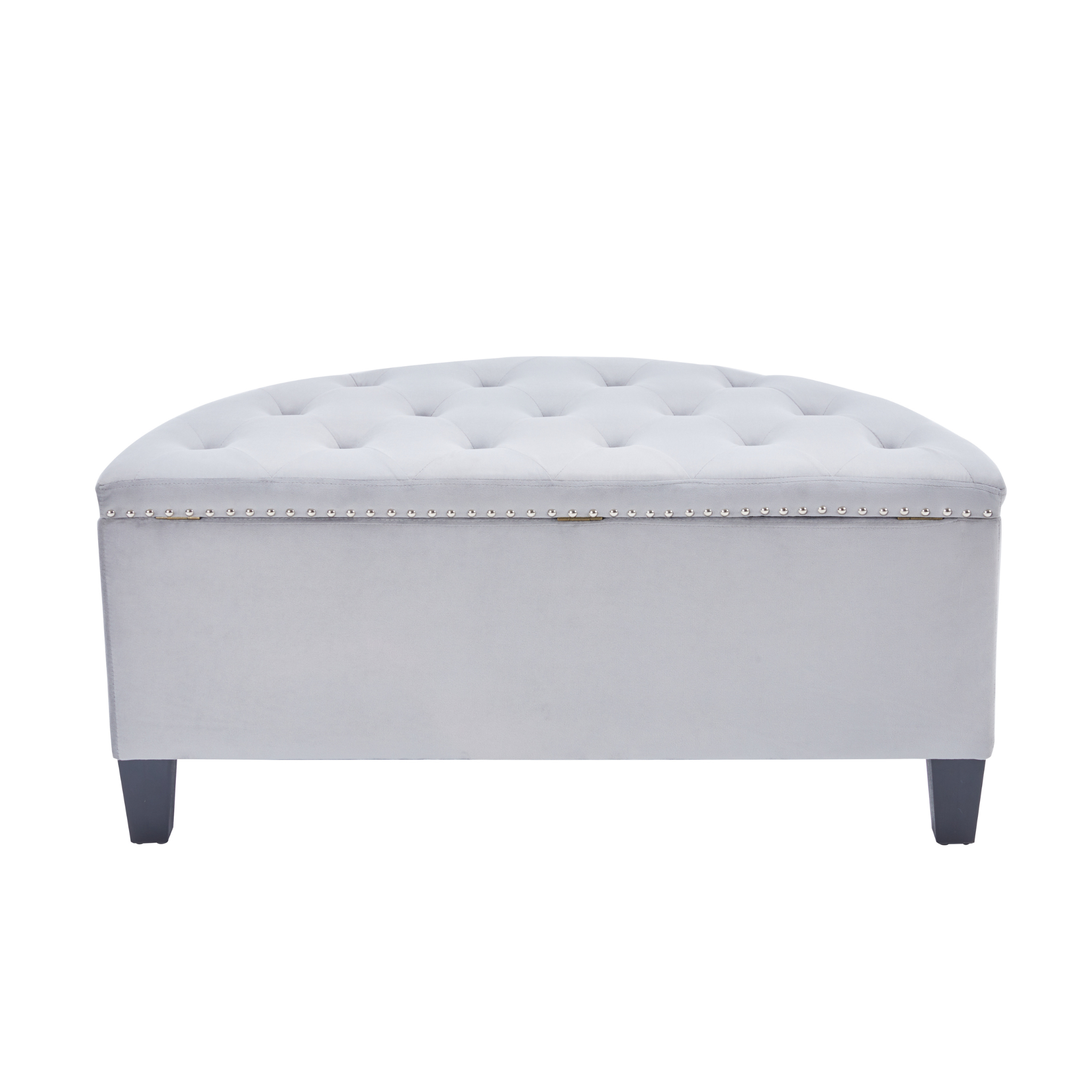 Upholstered in smooth velvet with tufted details and silver nailheads, this semi circle bench offers ample storage space for bedding, books, and more.
