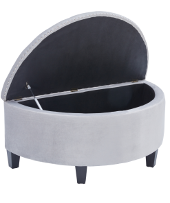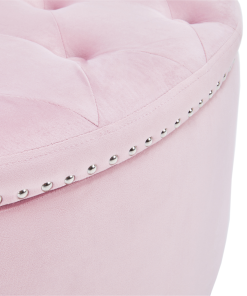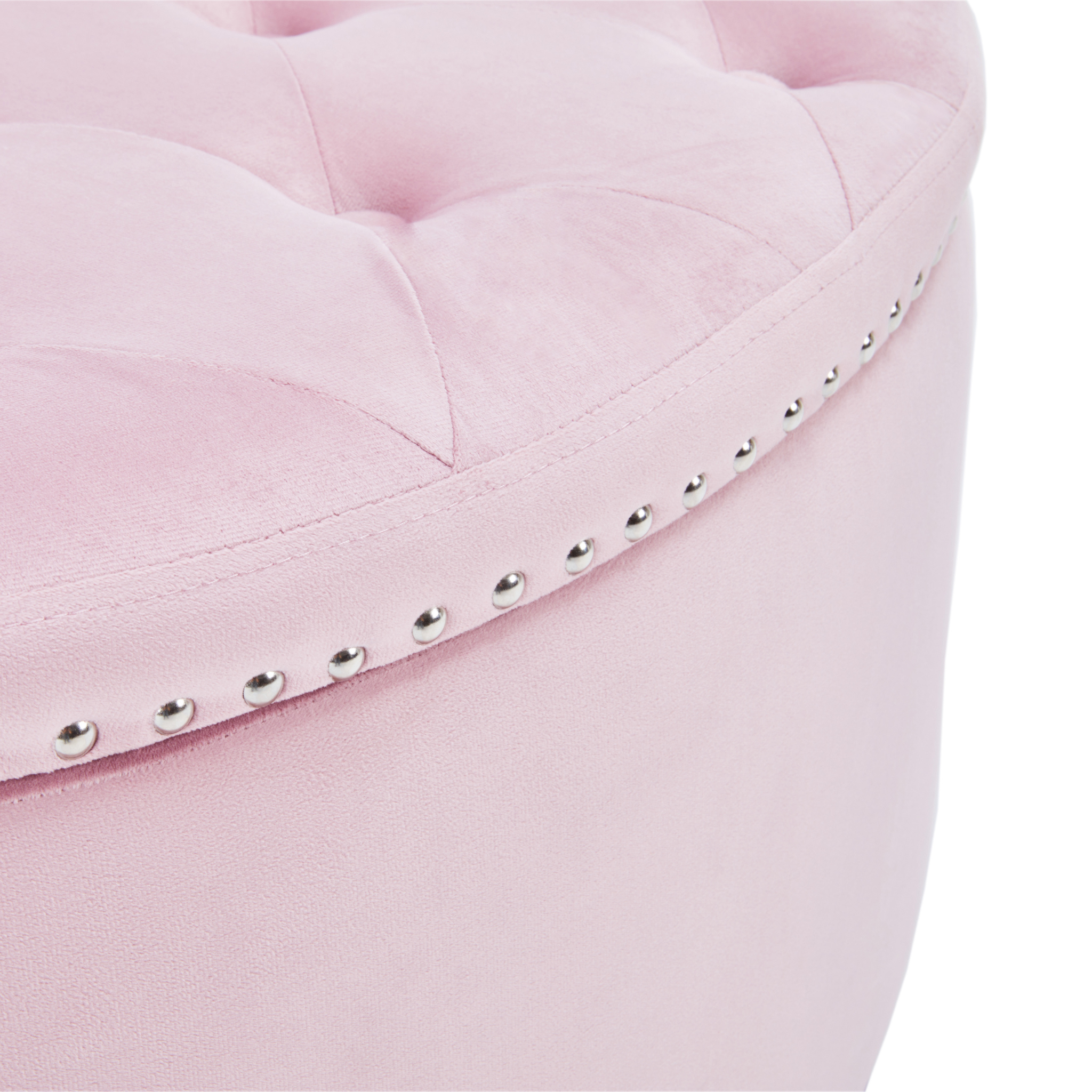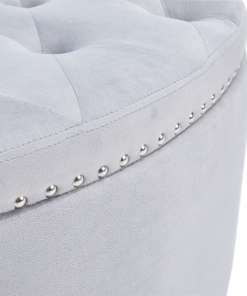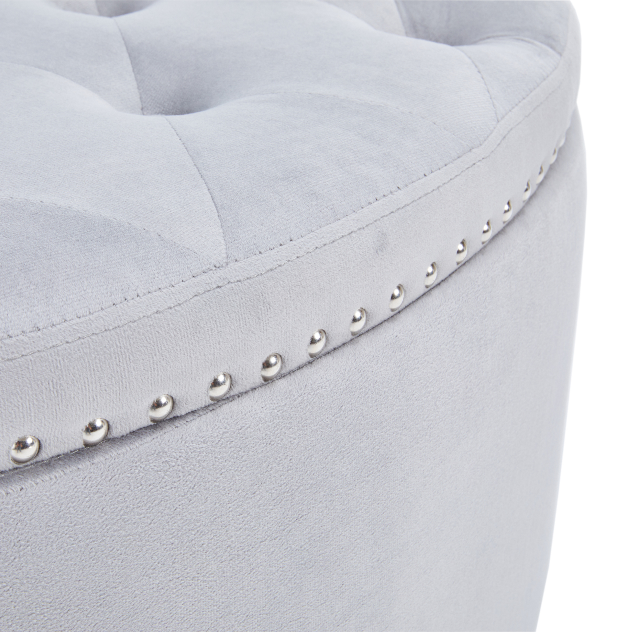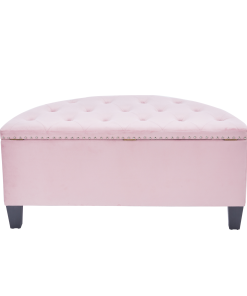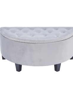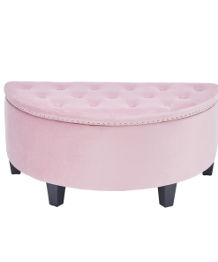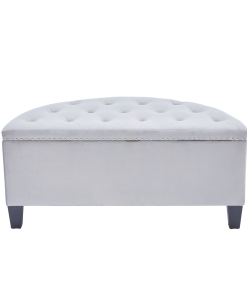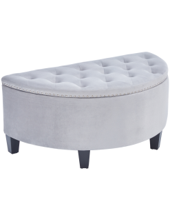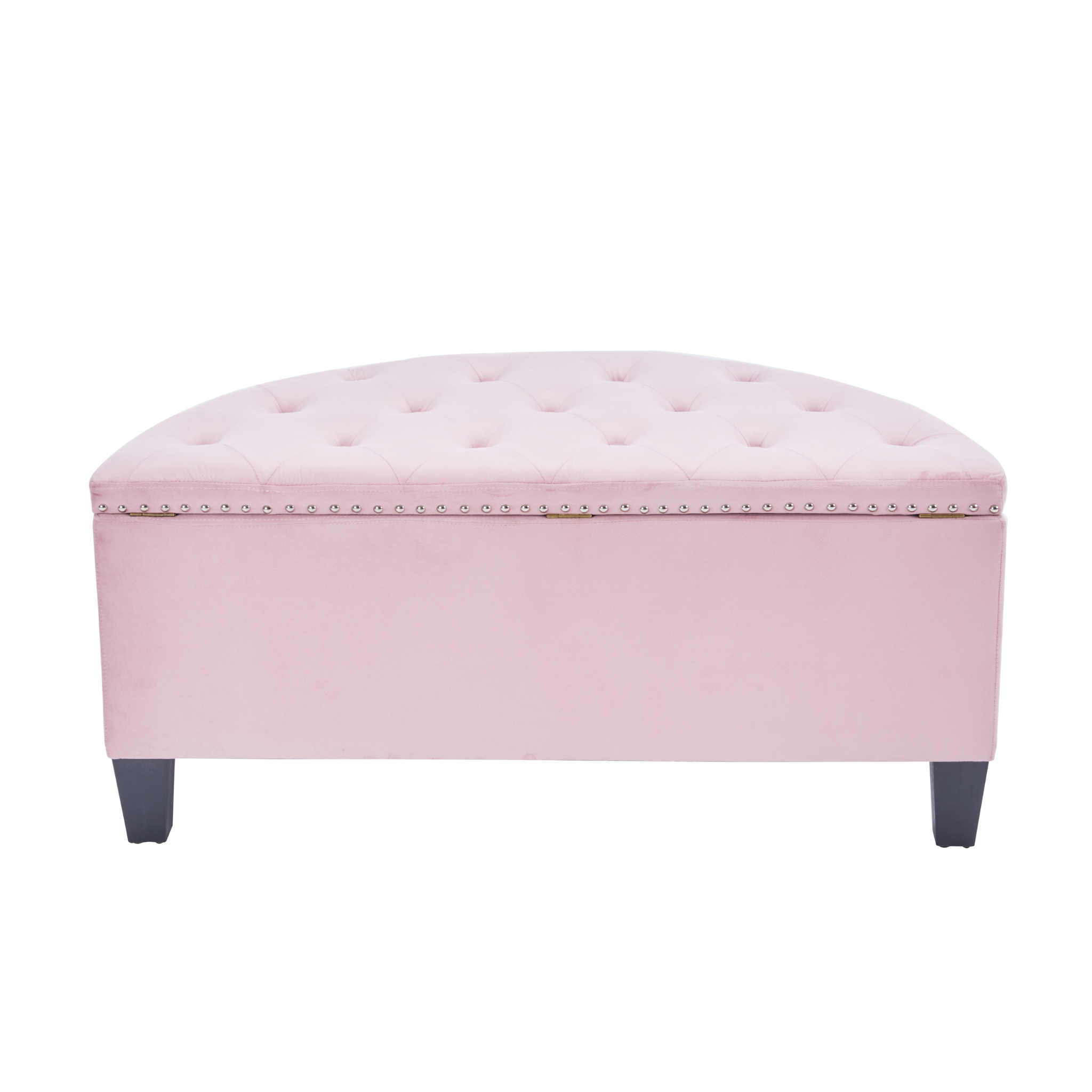Upholstered in smooth velvet with tufted details and silver nailheads, this semi circle bench offers ample storage space for bedding, books, and more.