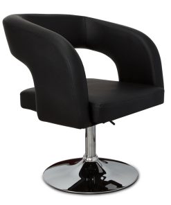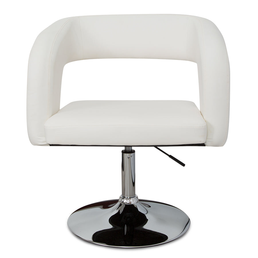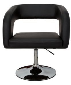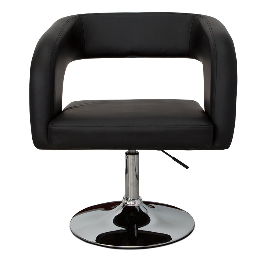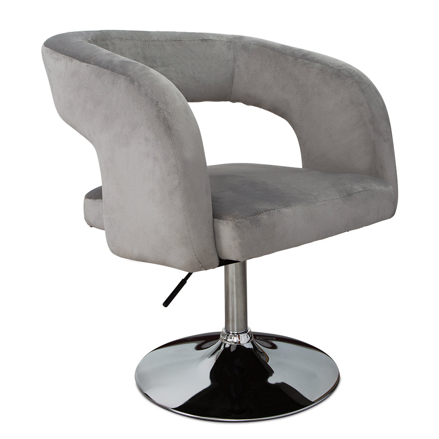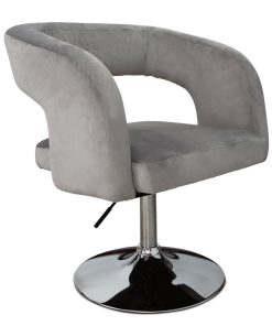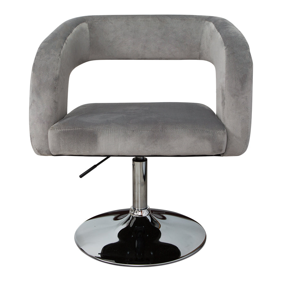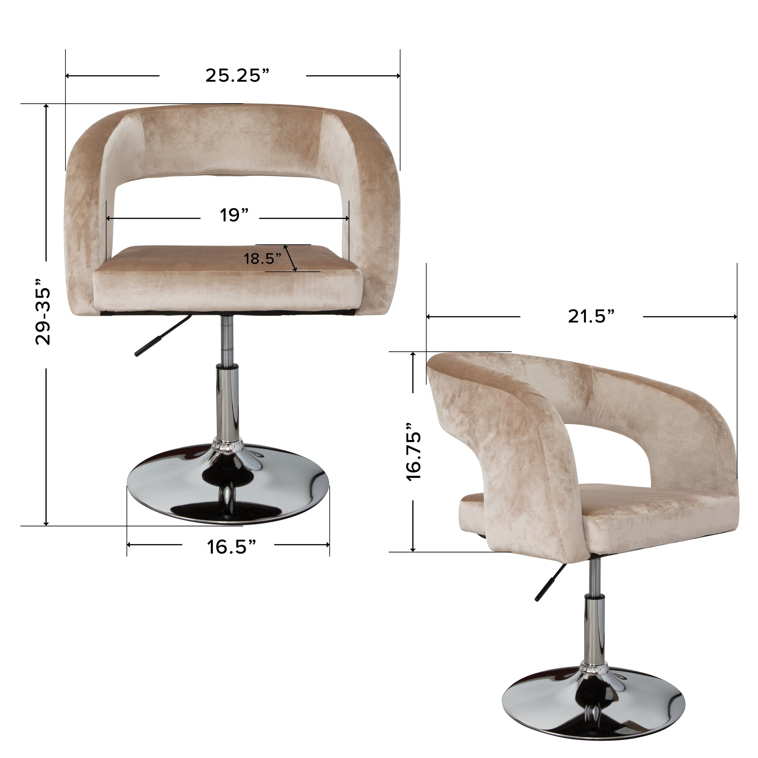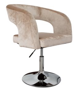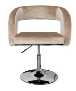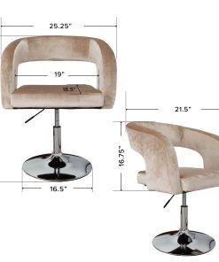 Enjoy sitting in style with the Ronni Modern Vanity Chair. A chic design with a wide cushioned seat and backrest. A pneumatic chair with a lever to adjust the height. Includes a polished, mirrored flat base and a 360-degree swivel seat. Available in leatherette or velvet material.