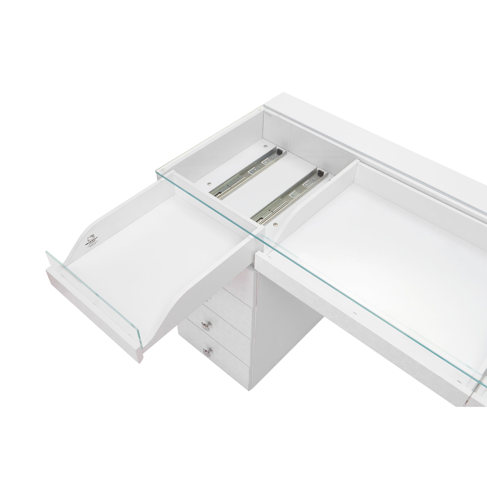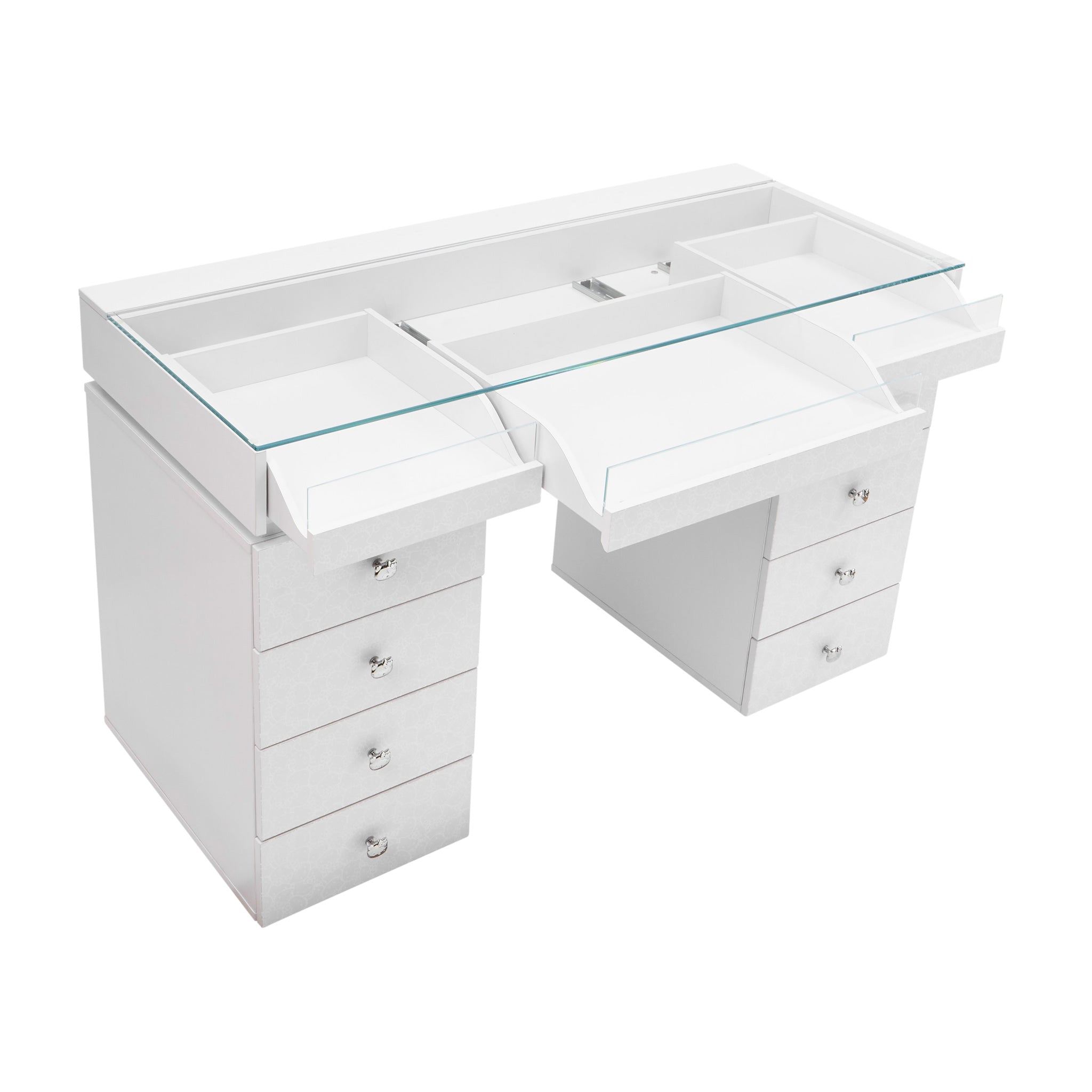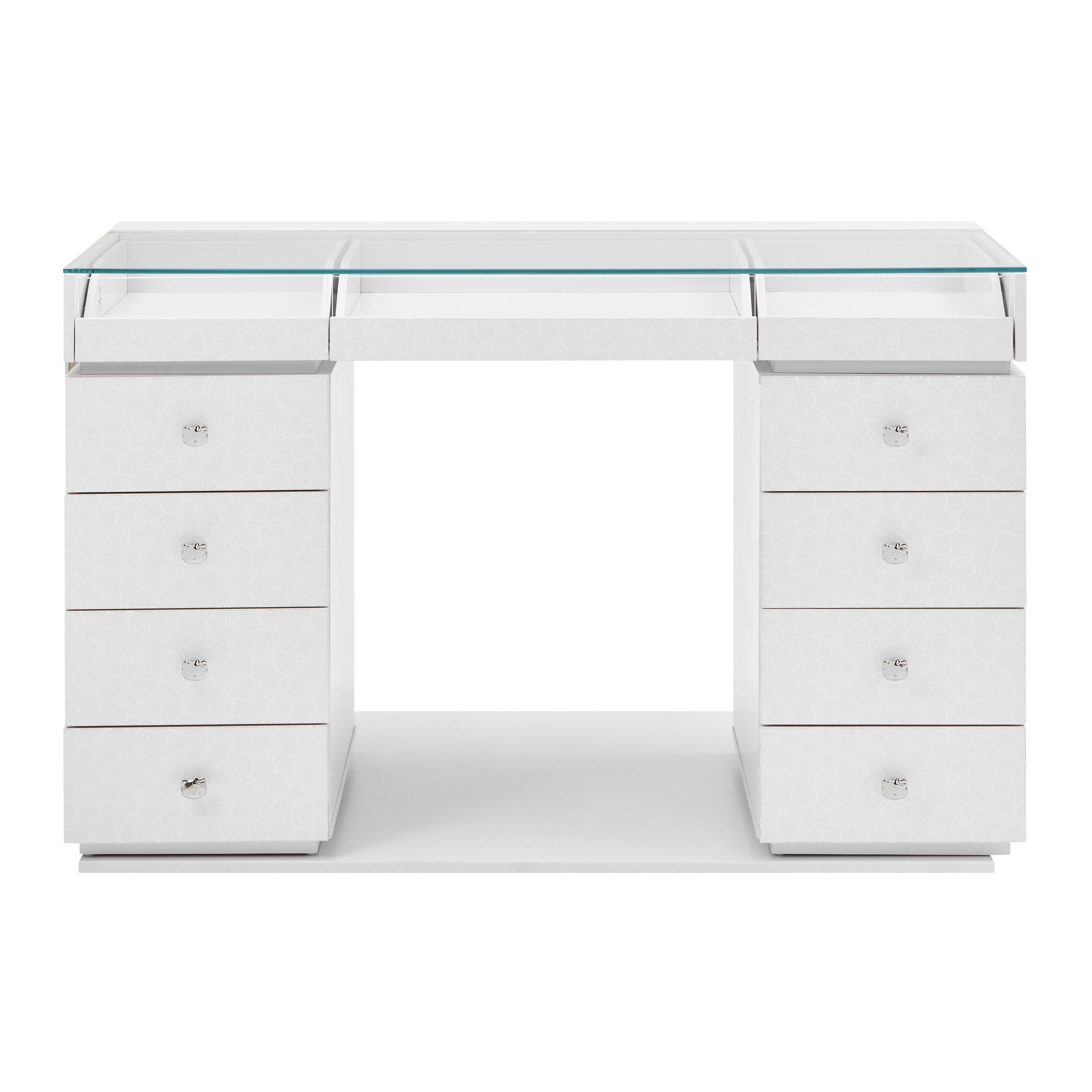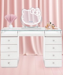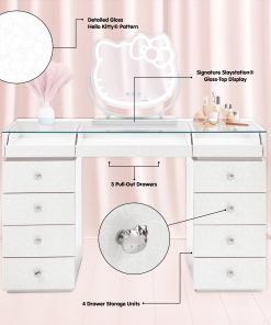 Get ready to create, play, and slay all day with our Hello Kitty® SlayStation® Vanity Table! This table was designed with love and that signature supercute charm we all know and adore. This vanity table is a dream come true for beauty lovers, and Hello Kitty fans everywhere!The SlayStation features an edge-to-edge clear glass top for you to display your vanity accessories and makeup. The top of the vanity includes 3 drawers with front glass panels. The side features 4 spacious drawers that are adorned with our special Hello Kitty knobs.**Wipe clean with soft damp cloth. Avoid using harsh chemicals on printed surface**