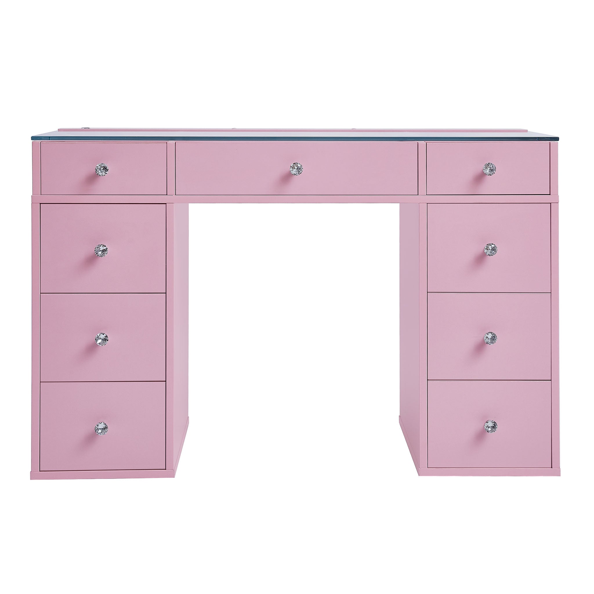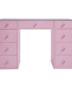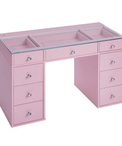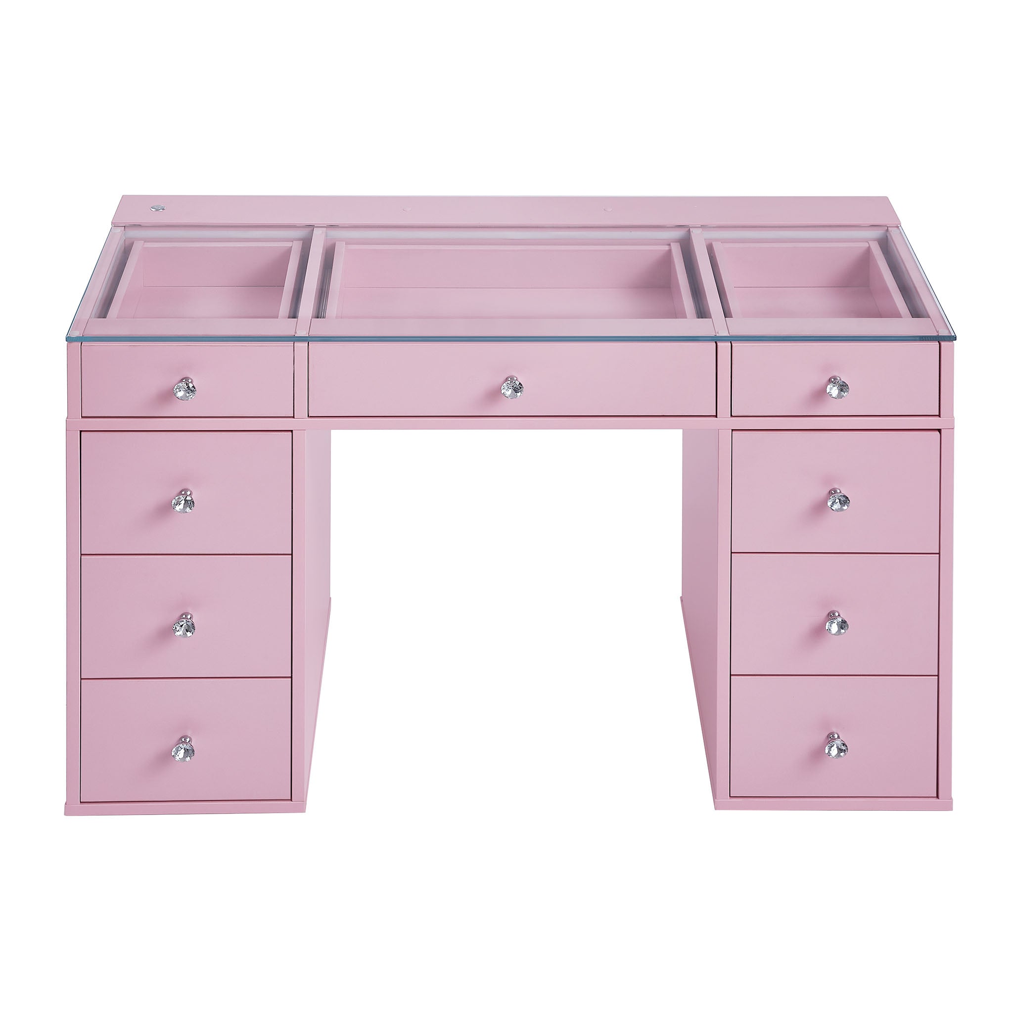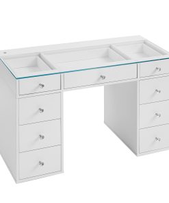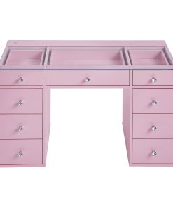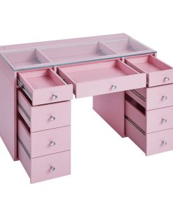 This mini version of our iconic SlayStation features a crystal-clear tabletop with a built-in LED light strip, perfect for illuminating all your favorite accessories, crafts, and treasures. Designed with little stars in mind, it offers plenty of drawer space to keep everything organized and within reach.
